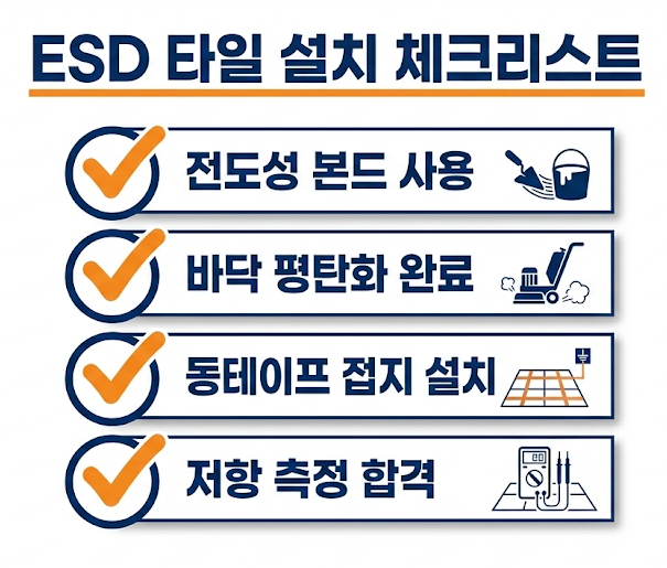 전도성 타일은 반드시 전도성 전용 접착제를 사용해야 합니다. 일반 본드를 사용하면 정전기 방전 경로가 차단되어 ESD 보호 기능이 무효화됩니다.