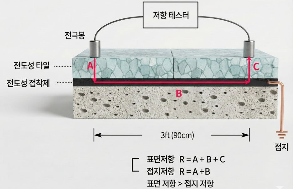 클린룸이나 반도체 공장에서 바닥은 가장 넓은 접지면입니다. 작업자가 어디로 이동하든 바닥을 통해 인체의 정전기가 안전하게 방전될 수 있어야 합니다.